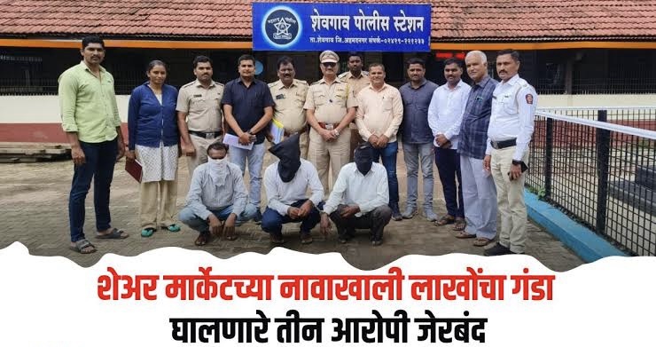 शेवगाव : शेअर मार्केटच्या नावाखाली लाखोंचा गंडा घालणारे तीन आरोपी शेवगाव पोलिसांनी आज सापळा लावून जेरबंद केले. सुनील बाबासाहेब पुरी, बाबासाहेब गोरक्षनाथ पुरी (दोघे रा. रावतळे कुरुडगाव, ता.शेवगाव) व शिवाजी कचरु वंजारी (रा.नजिक बाभुळगाव, ता.शेवगाव) अशी जेरबंद आरोपींची नावे आहेत.