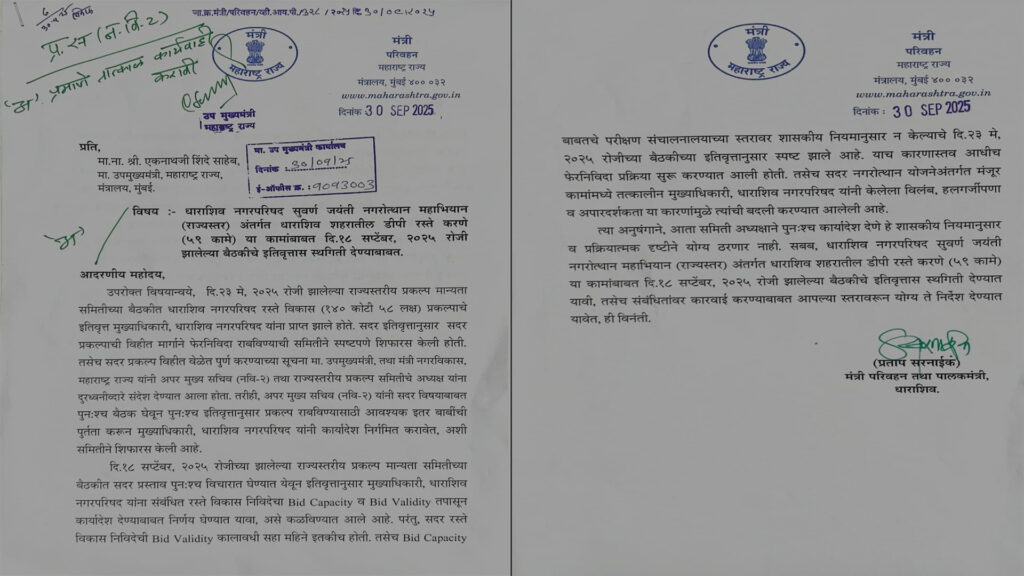 “धाराशिव नगरपरिषदेतील रस्ते विकास निविदांची Bid Capacity व Bid Validity तपासून तातडीने कार्यवाही करावी. नागरिकांच्या सोयीसाठी कोणताही विलंब नको.”