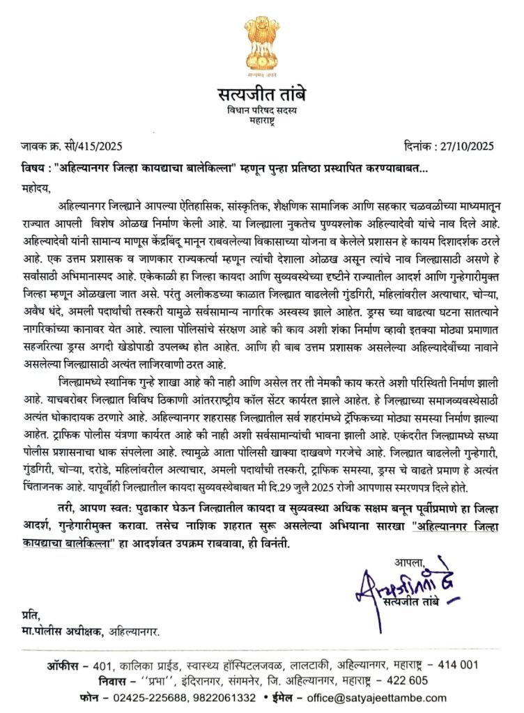 आमदार तांबे यांनी पत्रात नमूद केले आहे की, पुण्यश्लोक अहिल्यादेवी होळकर यांचे नाव जिल्ह्याला मिळणे अभिमानास्पद आहे, परंतु एकेकाळी कायदा आणि सुव्यवस्थेच्या दृष्टीने राज्यातील ‘आदर्श आणि गुन्हेगारीमुक्त’ म्हणून ओळखला जाणारा हा जिल्हा आता गुंडगिरी, महिलांवरील अत्याचार, चोऱ्या आणि अमली पदार्थांच्या तस्करीमुळे सर्वसामान्य नागरिकांसाठी धोकादायक बनला आहे.