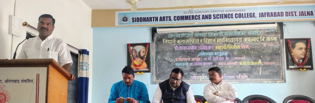 जालना: भारतीय संविधानाचे शिल्पकार, महामानव डॉ. बाबासाहेब आंबेडकर यांच्या ६९ व्या महापरिनिर्वाण दिनानिमित्त जाफराबाद येथील सिद्धार्थ महाविद्यालयात एका विशेष कार्यक्रमाचे आयोजन करण्यात आले होते. या कार्यक्रमातून महाविद्यालयातील प्राध्यापक, कर्मचारी आणि विद्यार्थ्यांनी बाबासाहेबांच्या महान कार्याला वंदन केले.