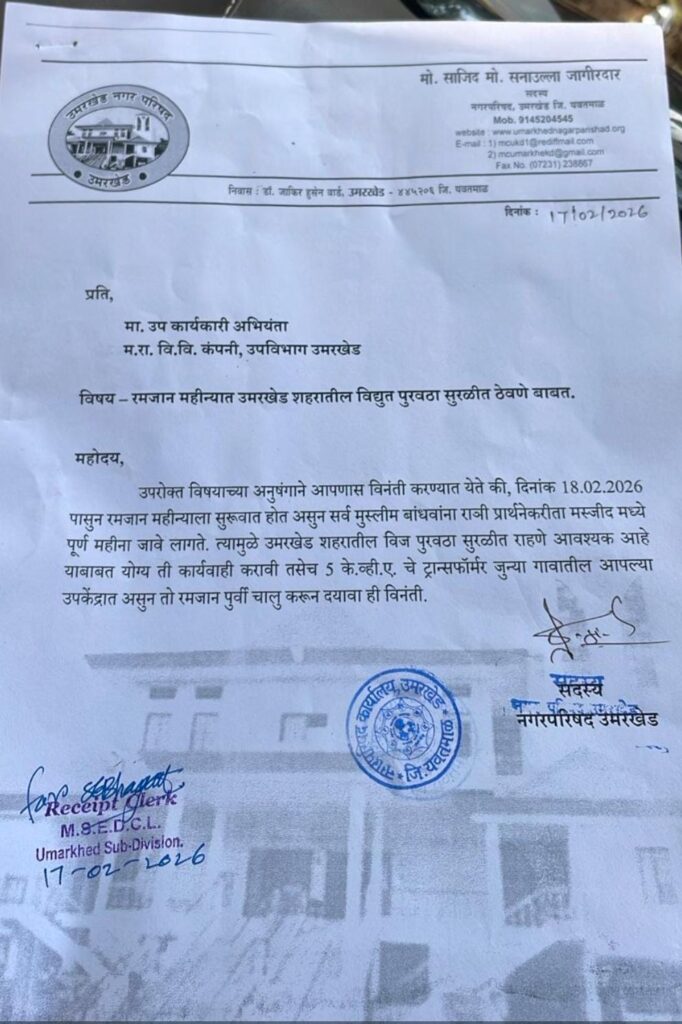यवतमाळ: पवित्र रमजान महिन्याला उद्यापासून (दि. १८ फेब्रुवारी) सुरुवात होत आहे. या पार्श्वभूमीवर, महिनाभर मुस्लिम बांधवांना रात्रीच्या वेळी नमाज आणि प्रार्थनेसाठी मशिदींमध्ये जावे लागते. ही बाब लक्षात घेऊन उमरखेड शहरातील विद्युत पुरवठा विस्कळीत न होता तो सुरळीत ठेवण्यात यावा, अशी मागणी नगरसेवक साजीद जागीरदार यांनी महावितरणकडे केली आहे.