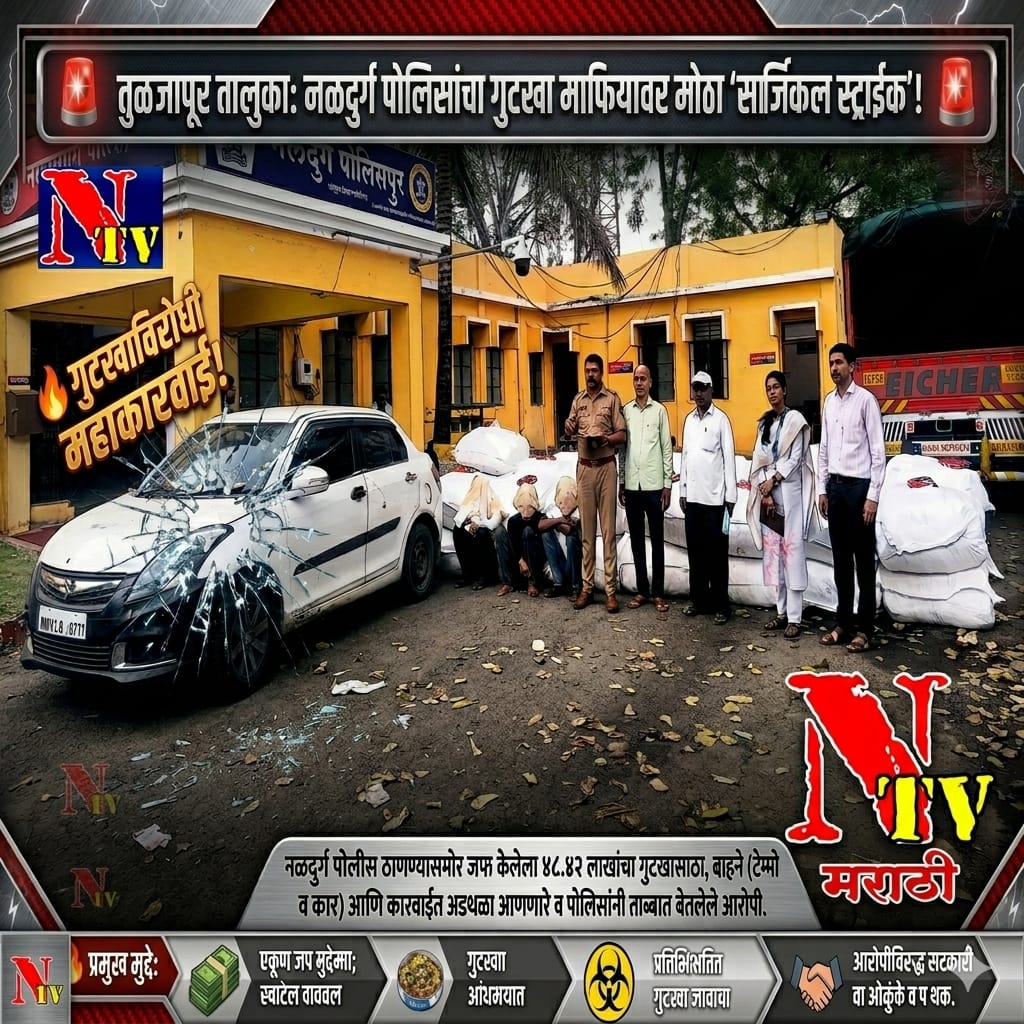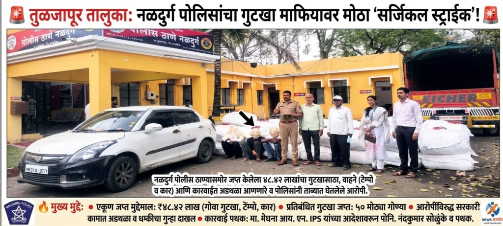 तुळजापूर तालुक्यातील नळदुर्ग पोलिसांनी गुटखा माफियांविरोधात एक मोठी आणि धाडसी कारवाई केली आहे. तब्बल ४८ लाख ४२ हजार ५०० रुपयांचा मुद्देमाल जप्त करण्यात आला असून, शासकीय कामात अडथळा आणणाऱ्या आणि पोलिसांनाच दमदाटी करणाऱ्या चौघांविरुद्ध गुन्हे दाखल करण्यात आले आहेत.