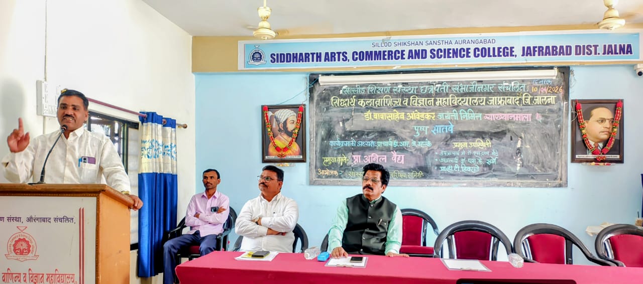 जाफराबाद प्रतिनिधी: दिनांक १०/०४/२०२६, येथील सिद्धार्थ कला वाणिज्य व विज्ञान महाविद्यालयात डॉ. बाबासाहेब आंबेडकर यांच्या जयंतीनिमित्त आयोजित व्याख्यानमालेत सातवे पुष्प प्रा.अनिल वैद्य यांनी “डॉ.आंबेडकर यांचे सामाजिक कार्य” या विषयावर मार्गदर्शन केले.कार्यक्रमाच्या अध्यक्षस्थानी महाविद्यालयाचे प्राचार्य डॉ.राहुल भाऊ म्हस्के होते तर उपप्राचार्य प्रा. विनोद हिवराळे यांची प्रमुख उपस्थिती होती.