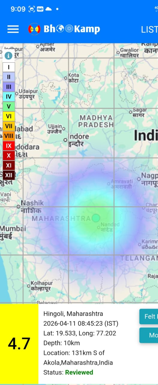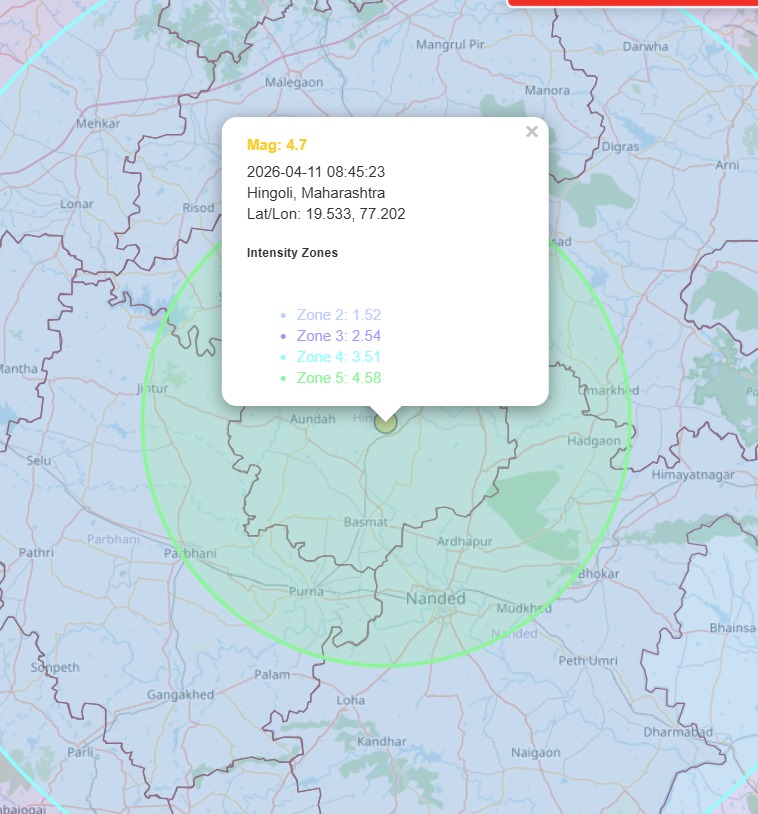 दिनांक 11 एप्रिल 2026 रोजी हिंगोली जिल्ह्यात रिश्टर स्केलवर 4.7 तीव्रतेचा भूकंप नोंदविण्यात आला.