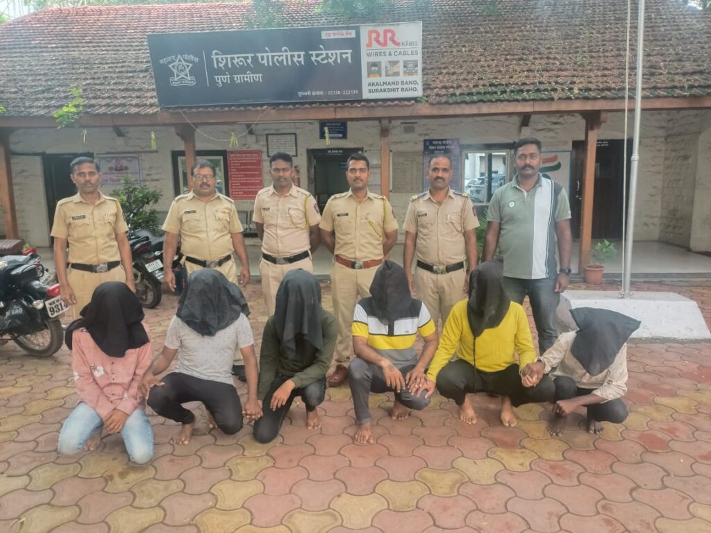 अविष्कार संभाजी लांडे वय -२२ रा.सोनारआळी, शिरूर ता.शिरूर जि.पुणे ,अक्षय महेंद्रसिंग परदेशी वय – २३ वर्षे,रा.काचेआळी ,शिरूर ता.शिरूर जि.पुणे, कैलास लक्ष्मण ननवरे वय – २३ वर्षे, रा.रामलिंग ता.शिरूर जि.पुणे, हर्षल मनोहर काळे वय -२२ वर्षे, रा.ढोर आळी,शिरूर ता.शिरूर जि.पुणे, अमोल हेमंत लुनिया वय – २७ वर्षे रा.रामलिंग रोड, शिरूर ता.शिरूर जि.पुणे, अमोल उर्फ दादा अंकुश खिलारे वय -२५ वर्षे रा.लाटेआळी ,शिरूर ता.शिरूर जि.पुणे अशी अटक करण्यात आलेल्या आरोपींची नावे असून त्यांना २०/०९/२०२२ पर्यंत पोलीस कस्टडी रिमांड असल्याची माहिती पोलीस सब इन्स्पेक्टर विक्रम जाधव यांनी दिली.